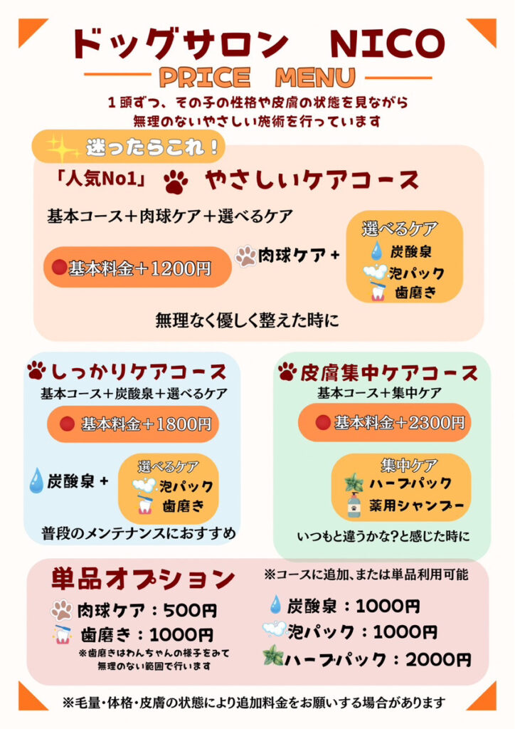 (肉球ケア 500円 炭酸泉 1,000円 歯磨き 1,000円 泡パック 1,000円 ハーブパック 2,000円)