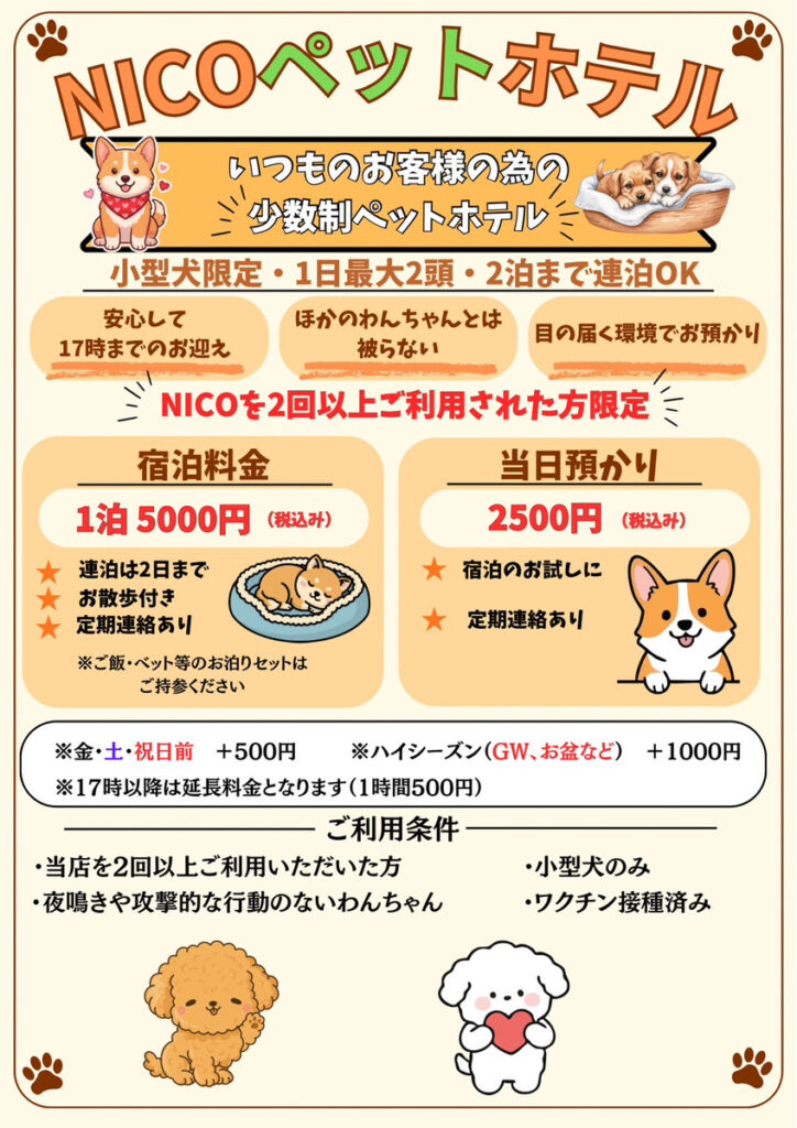 • ワクチン接種済みのワンちゃんのみご利用いただけます。